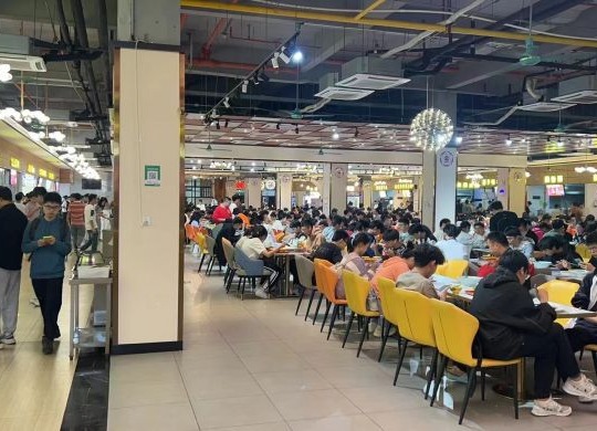 学校位于番禺大学城区工业大学、三万人的本科大学,学校里面有读博士,研究生,这学校在广东省内排进前五名的。学校内外没有商业街的,学生每天4餐都只能在食堂里面就餐,食堂在于宿舍区域四周宿舍包围着,食堂家家档口人流爆满